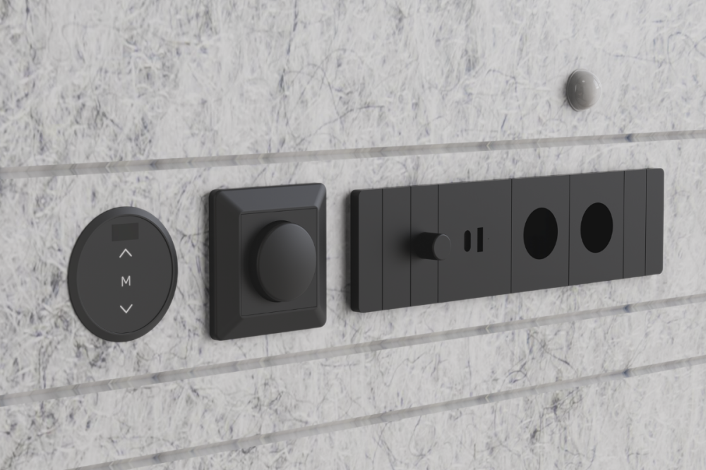 - Wandopbouw: 12 mm carbonplaat met PVC-film, 45 mm staalframe met geluidsisolerende vulling, aluminium afwerking en brandwerend schuim.